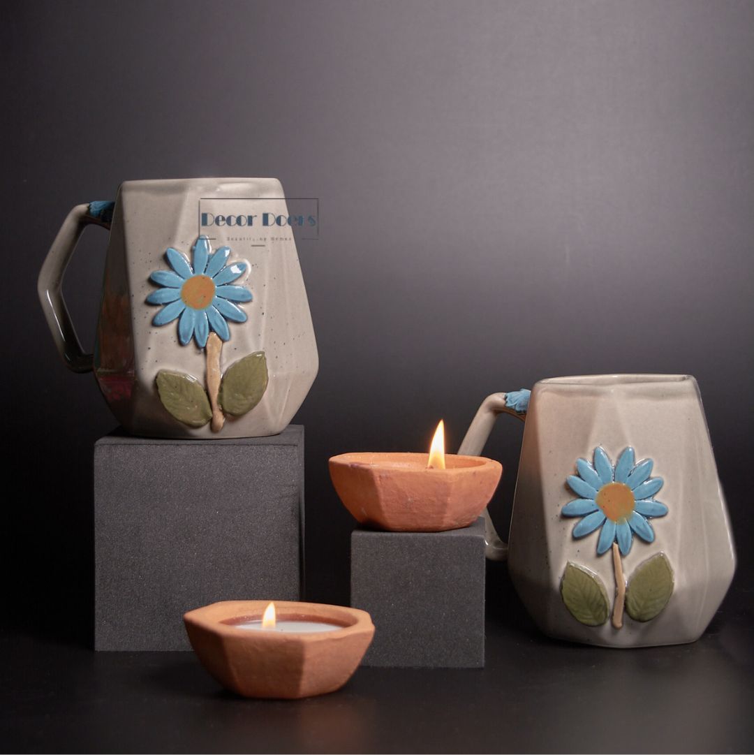 Add elegance and charm to your daily coffee or tea ritual with the Stylish Grey Flower Mug Set of 2 | Hand-painted Ceramic Mugs by Decor Doers. These hand-painted ceramic mugs feature a unique 3D floral design with a blue flower and green leaves, making them both stylish and functional.